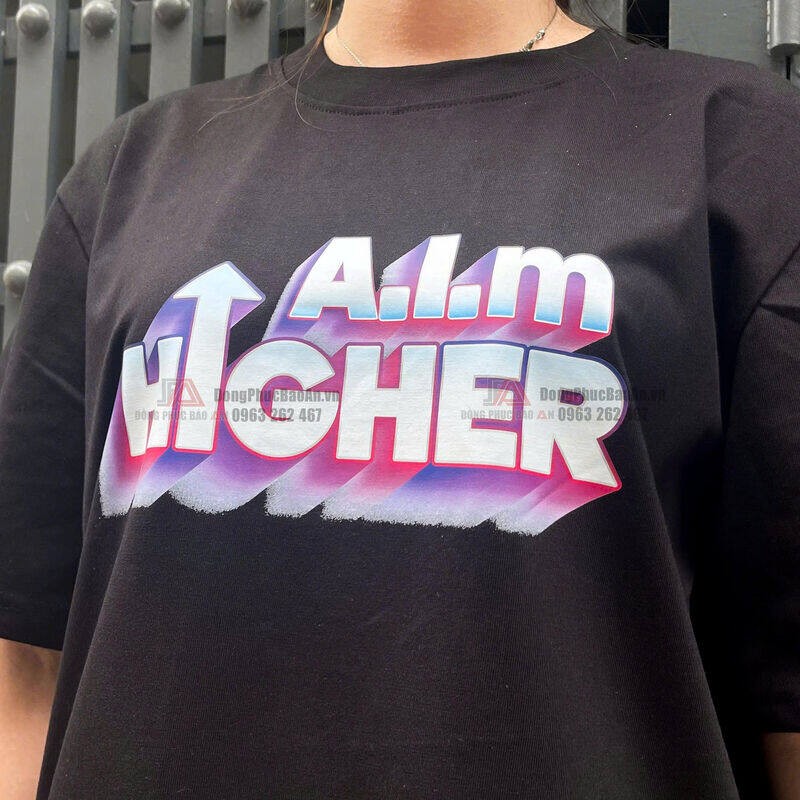 Đã là áo thun sự kiện thì không thể thiếu hình in. Đối với mẫu áo này, hình in “A.I.m HIGHER” cùng biểu tượng mũi tên hướng lên trên được in nổi khối đẹp mắt và ấn tượng. Phía sau áo in logo và tên thương hiệu màu trắng nổi bật trên nền áo đen. Công nghệ in hiện đại không chỉ mang đến hình in sắc nét, chuẩn màu mà còn không bị lem hay bong tróc sau nhiều lần giặt.