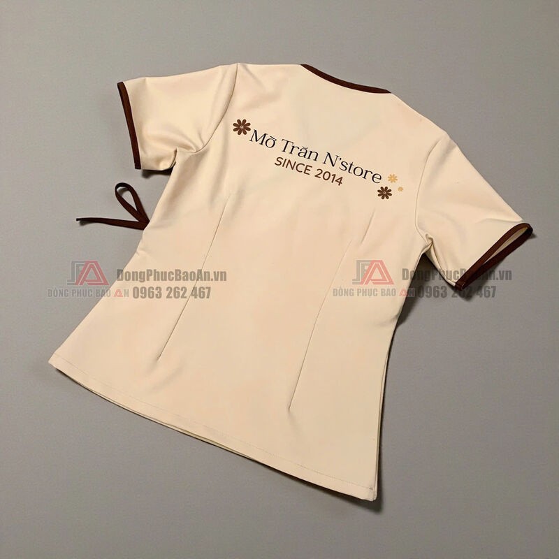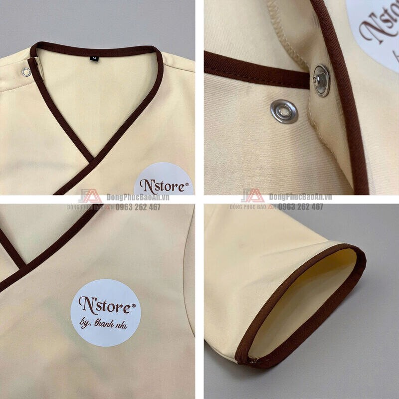 Bộ đồng phục spa cổ tim cách điệu thiết kế riêng cho N’store – đơn vị chuyên cung cấp mỡ trăn và sản phẩm làm đẹp. Với gam màu vàng nhạt đặc trưng gợi nhớ đến sắc mỡ trăn tự nhiên, bộ trang phục mang lại sự nhận diện thương hiệu rõ nét. Đồng thời tạo cảm giác nhẹ nhàng, thư giãn cho khách hàng khi gặp gỡ các kỹ thuật viên, tư vấn viên.