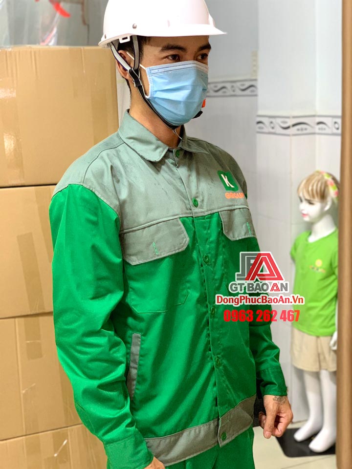 - Áo bảo hộ lao động cơ khi được phối may 2 màu vải là xanh lá và ghi xám theo yêu cầu của đơn vị khách hàng. Áo cổ bẻ cổ điển, tay dài với khuy cài 1 nút. Áo có thiết kế khuy cài giữa cùng hai túi trước ngực nắp đậy hai bên. Phần thiết kế túi mổ hai bên hông áo cũng được phối may chặt chẽ. Lai áo cao, bảng ngang, phối màu ghi xám, có dún thun ở hai bên hông, tạo sự co giãn tiện dụng khi mặc. Chi tiết dún thun này còn giúp áo bảo hộ đứng form hơn khi mặc vào người.