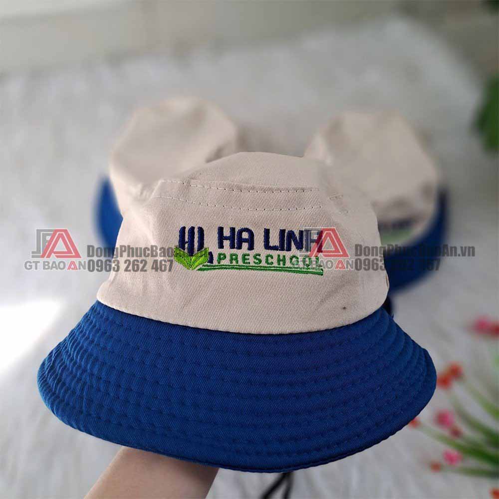 Logo trường mầm non Hà Linh được thêu vi tính phía trước nón. Hình thêu đều đặn sắc nét, nổi bật thương hiệu trường.