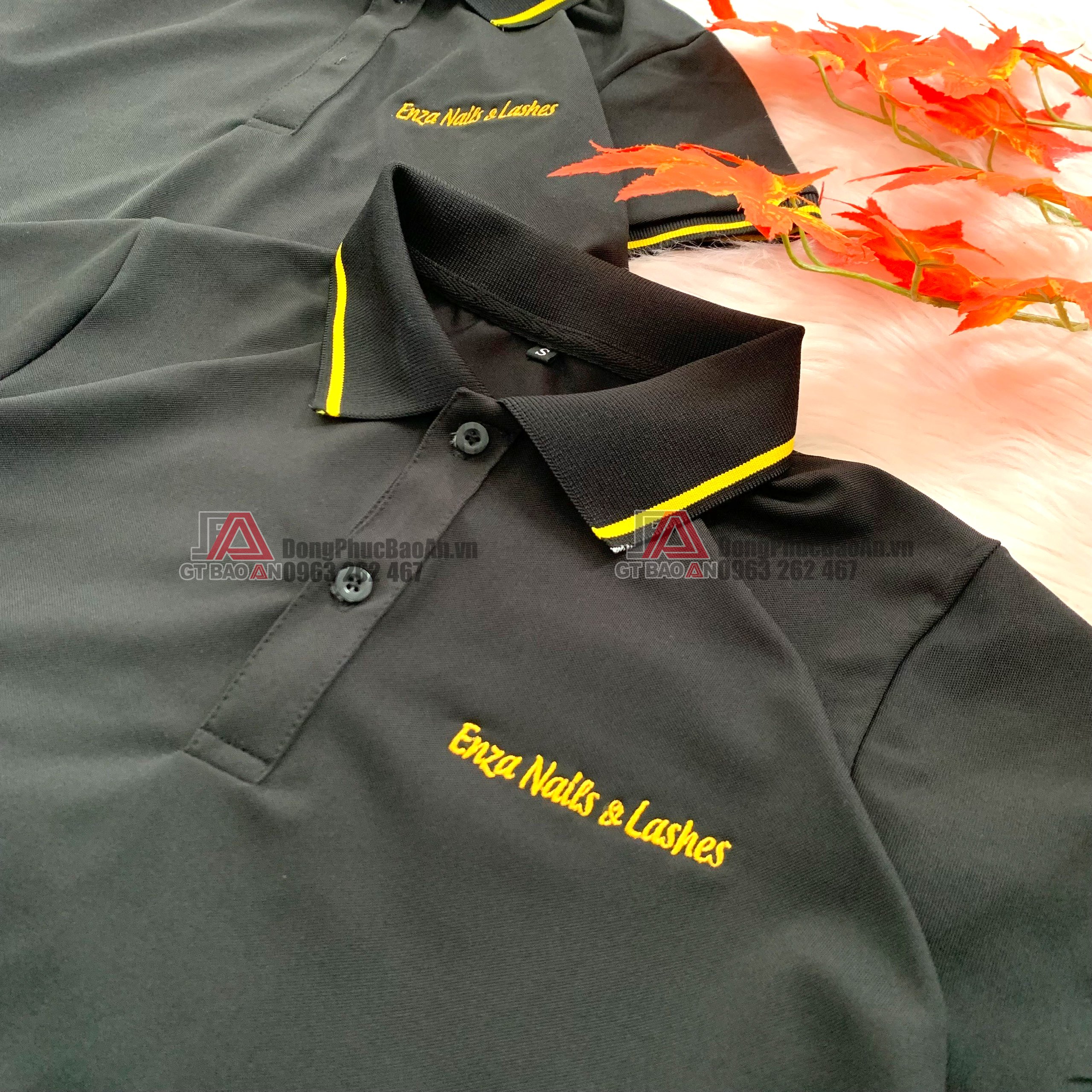 Áo thun đồng phục tiệm nails Enza Nails & Lashes màu đen chủ đạo với thiết kế cổ bẻ tay ngắn phối viền vàng ở cổ áo và bo tay áo, giúp mẫu áo trở nên đẹp và có điểm nhấn hơn.