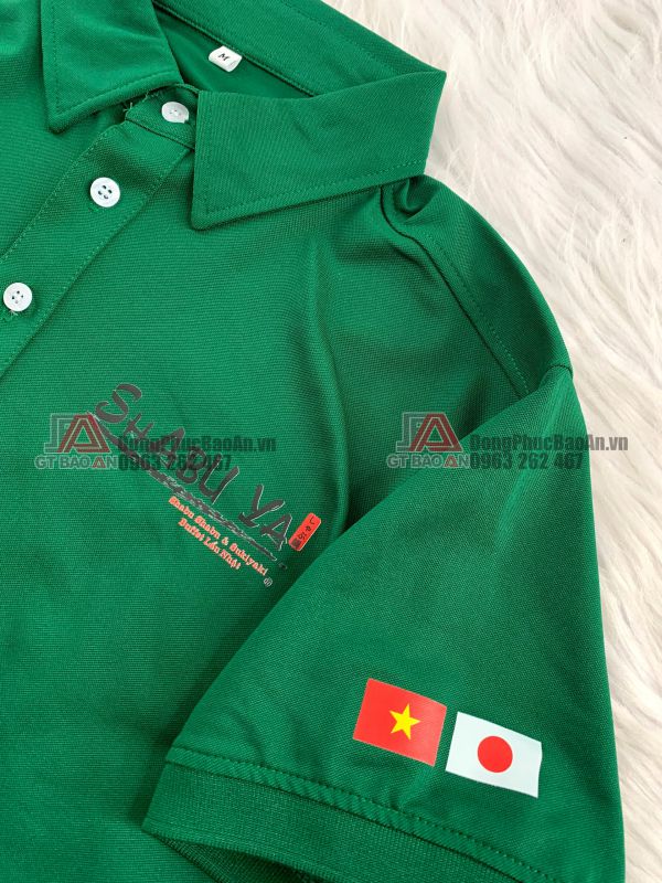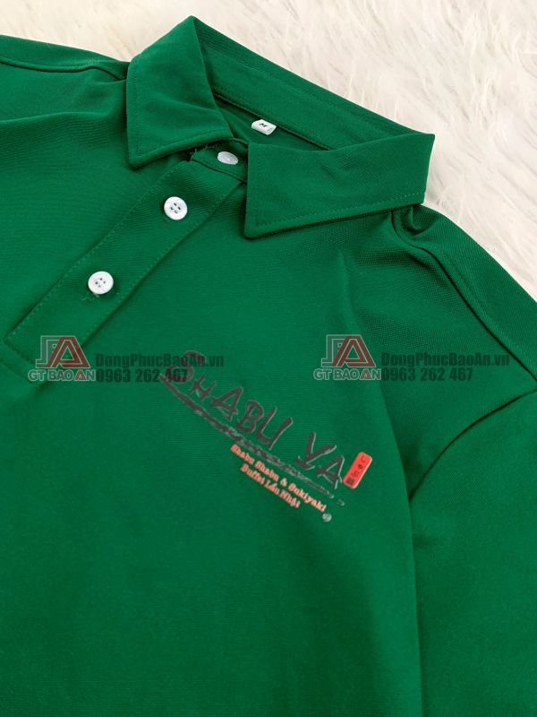 Logo nhà hàng SABUYA được in sắc nét, đều đặn, tỉ mỉ ở phía trước áo và 1 bên tay áo, nổi bật lên thương hiệu nhà hàng. Ngoài ra, BẢO AN còn nhận in thêu logo theo yêu cầu của quý khách hàng.