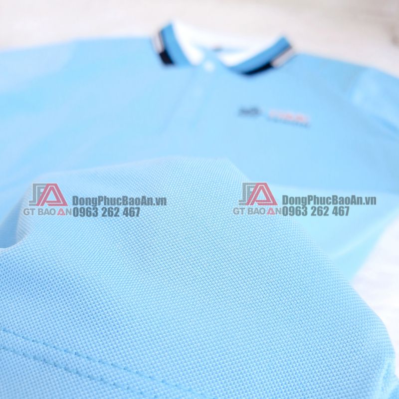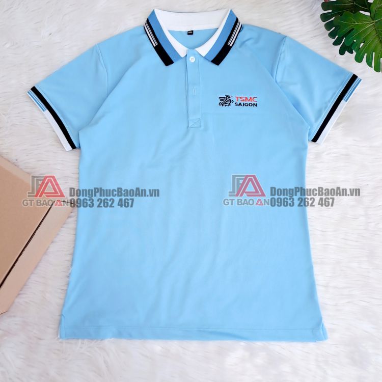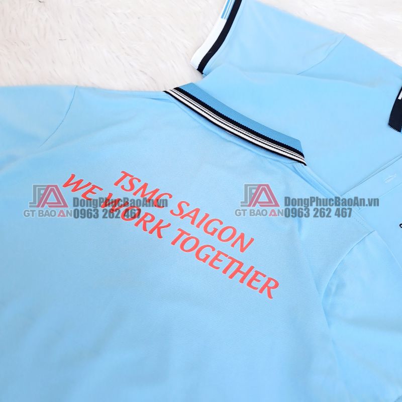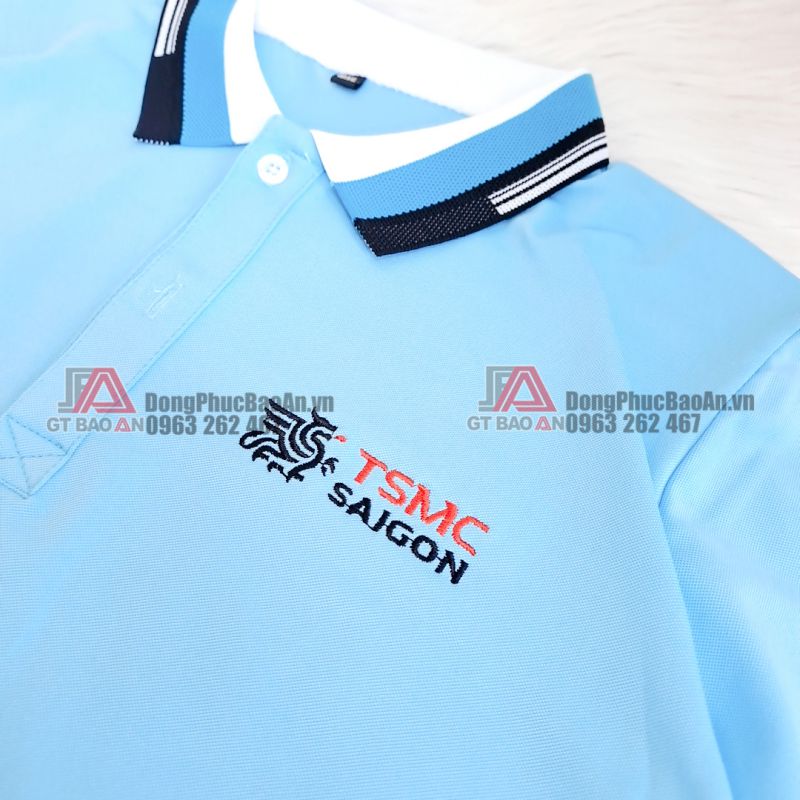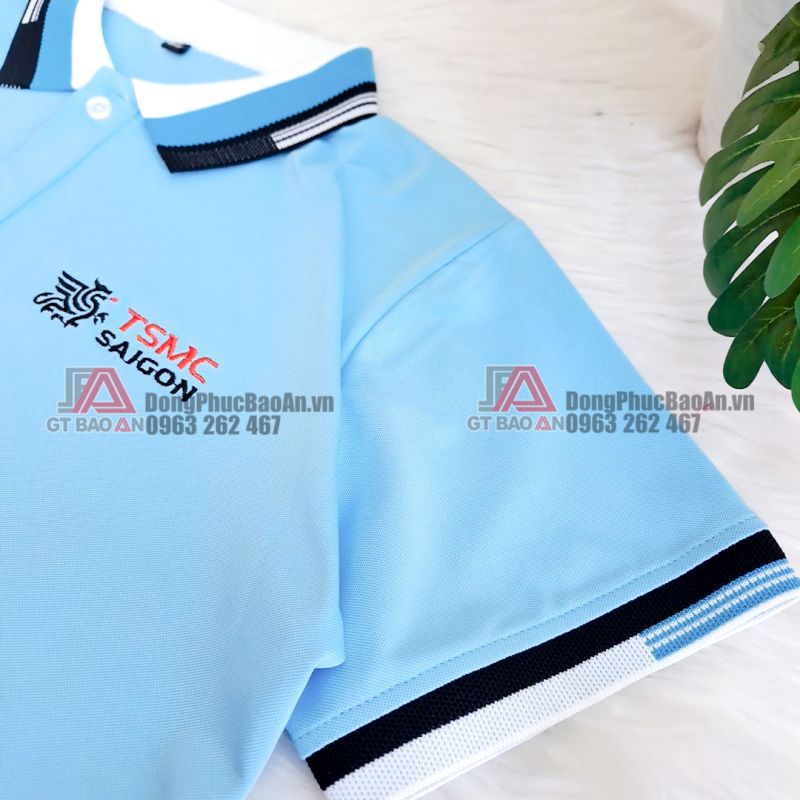Đồng phục áo thun nhóm có in logo theo yêu cầu TSMC Saigon có thiết kế đơn giản với kiểu dáng áo polo cổ trụ, vừa lịch sự nhưng không kém phần năng động. Với màu áo xanh thiên thanh tạo sự thanh lịch, chỉn chu hơn trong tác phong làm việc. Áo thiết kế cổ trụ phối bo, tay ngắn, có xẻ tà, form áo thoải mái vừa với từng dáng người theo size.