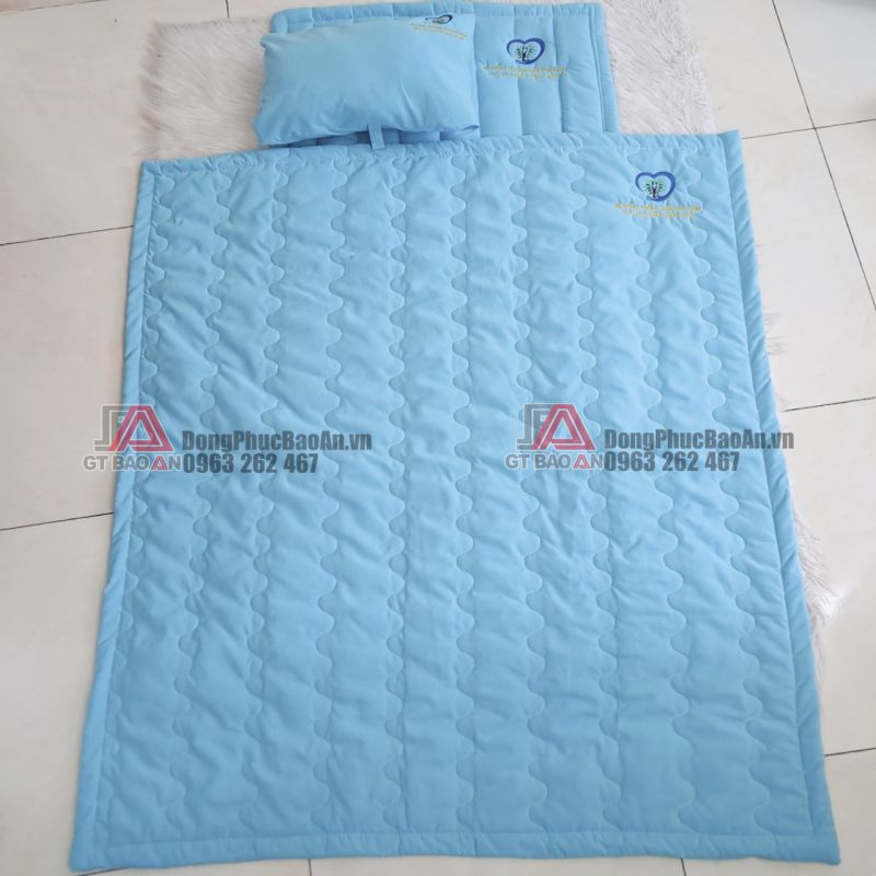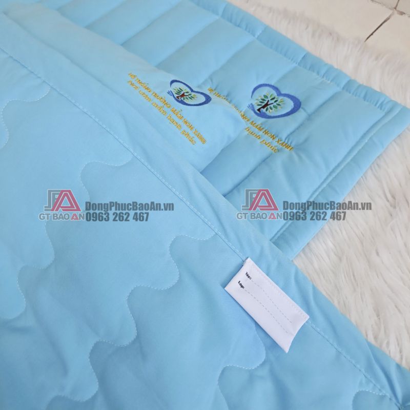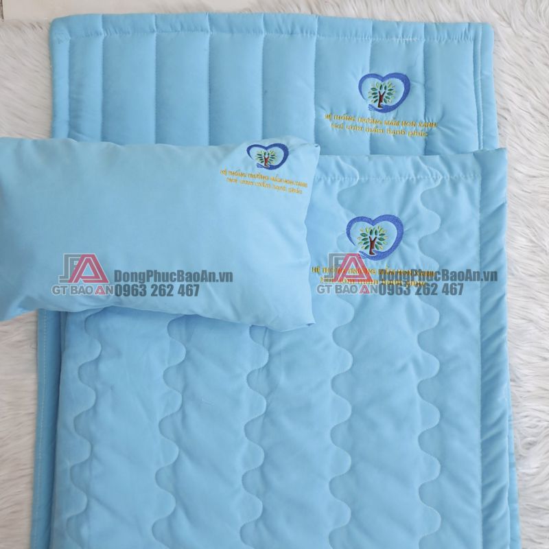 Bộ chăn gối cho bé mầm non thêu logo trường Mầm non Xanh