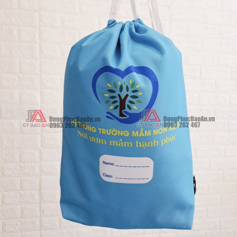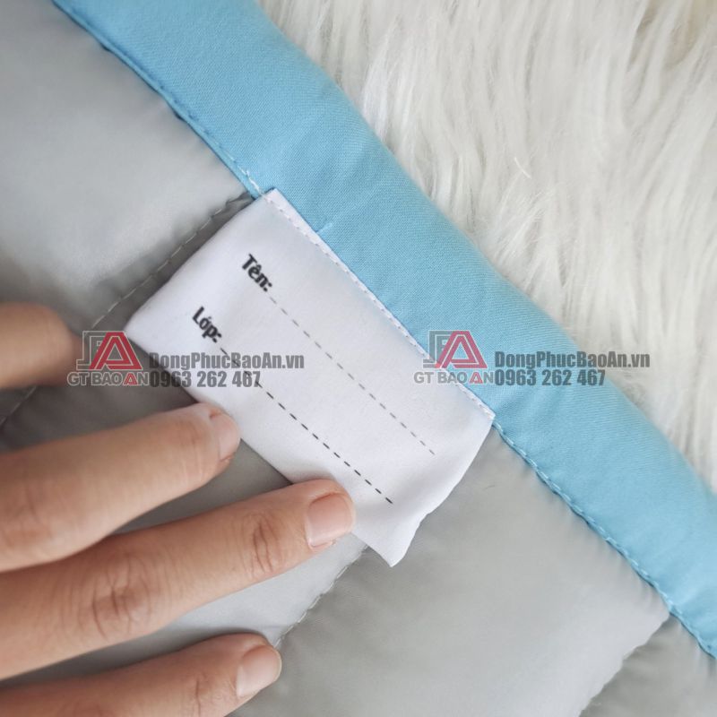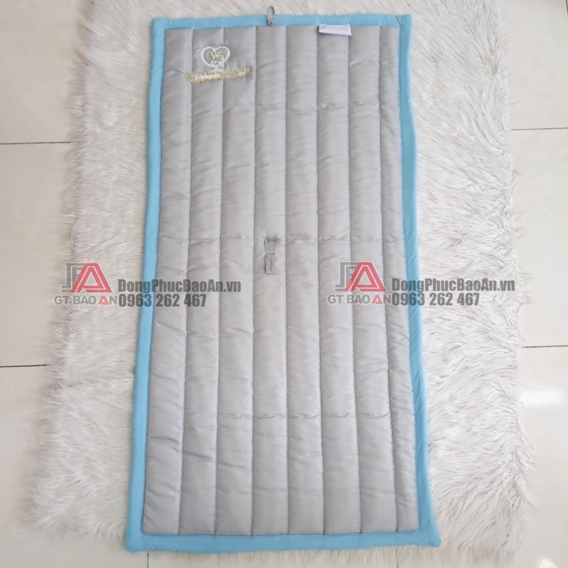 Logo mầm non Xanh được thêu ở các vị trí góc của đệm, gối, ga, túi. Tại BẢO AN có nhận thêu logo theo yêu cầu, đường thêu tỉ mỉ, đều đặn.