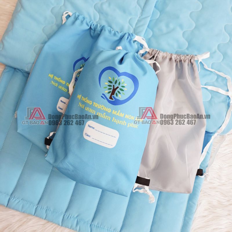 Bộ chăn gối cho bé mầm non thêu logo trường Mầm non Xanh với set gồm: Chăn, đệm, gối, túi rút: