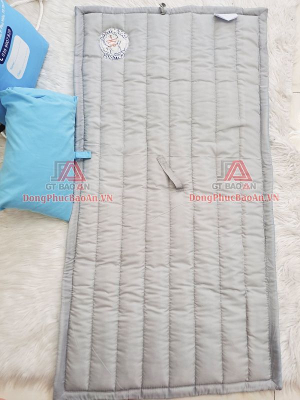 -Tấm nệm với mặt trên cùng là lớp vải 100% cotton Hàn Quốc mềm mại thoáng mát, ở giữa là lớp gòn mềm và cuối cùng là lớp chống thấm giúp trải lên sàn không dơ, thuận tiện thay giặt. Phía bên góc trên cùng là logo trường thêu đều đặn, tỉ mỉ.