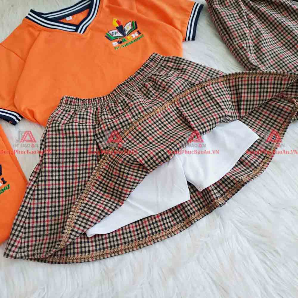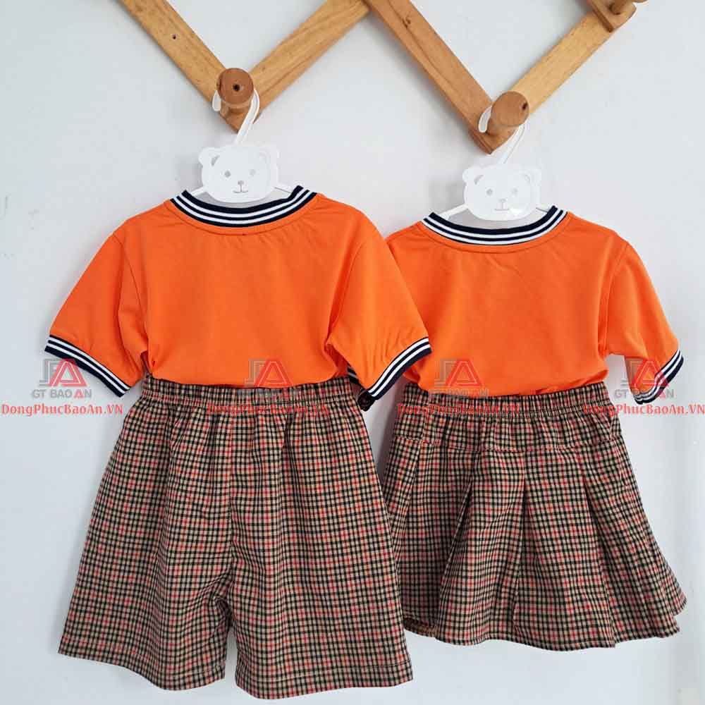 - Màu sắc: Áo cam kết hợp viền trắng đen ở cổ áo và tay áo, quần/váy caro