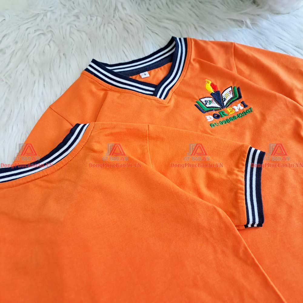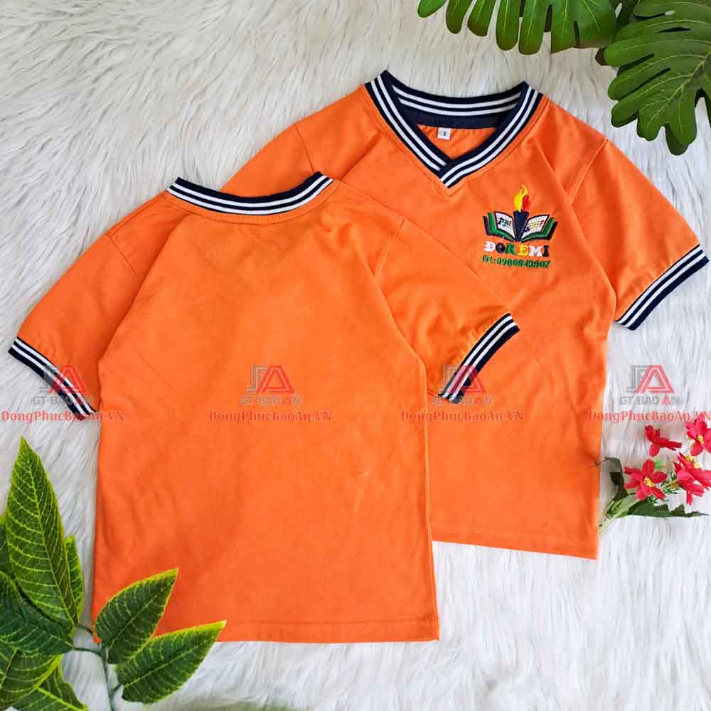 Đồng phục cho trẻ mầm non Trường mầm non Đoremi với thiết kế theo kiểu phương Tây. Đây là mẫu áo màu cam với kiểu cổ bẻ phổ biến. Với thiết kế tay ngắn giúp các bé thoải mái và dễ mặc. Có phối viền trắng đen ở cổ và tay áo tạo điểm nhấn.