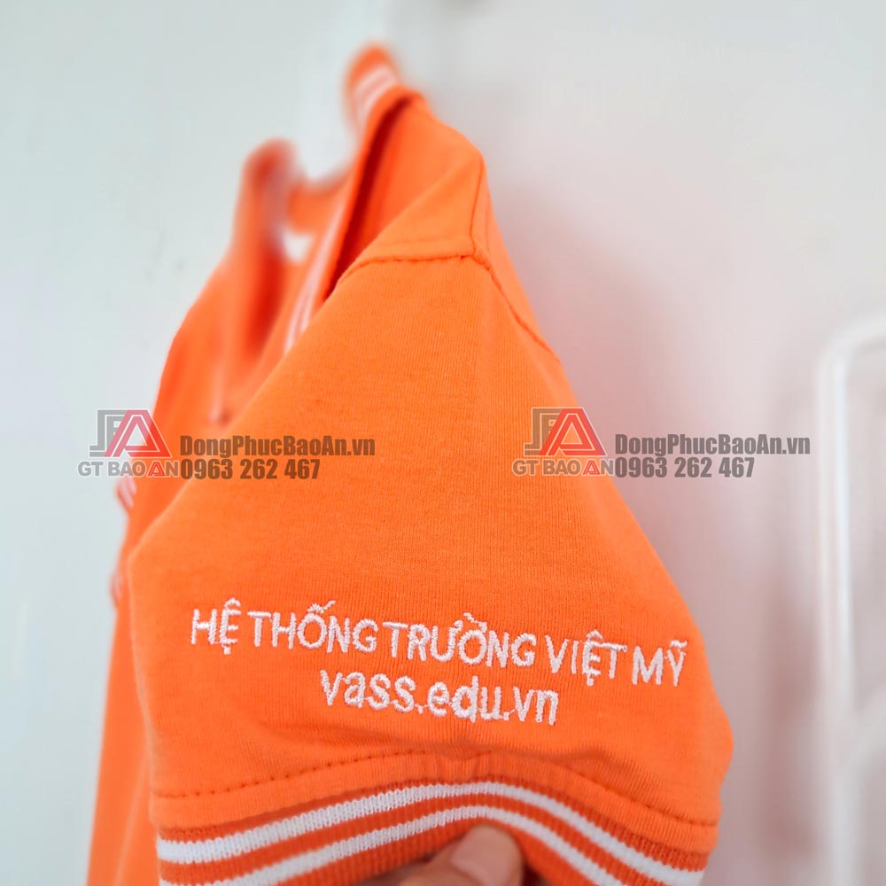 Đồng phục quần áo học sinh mầm non quốc tế Việt Mỹ với thiết kế theo kiểu phương Tây. Đây là mẫu áo màu cam với kiểu cổ bẻ phổ biến, tạo sự năng động, khỏe khoắn cho các bé vui chơi. Với thiết kế tay ngắn giúp các bé thoải mái và dễ mặc. Có phối viền trắng ở cổ và tay áo tạo điểm nhấn.