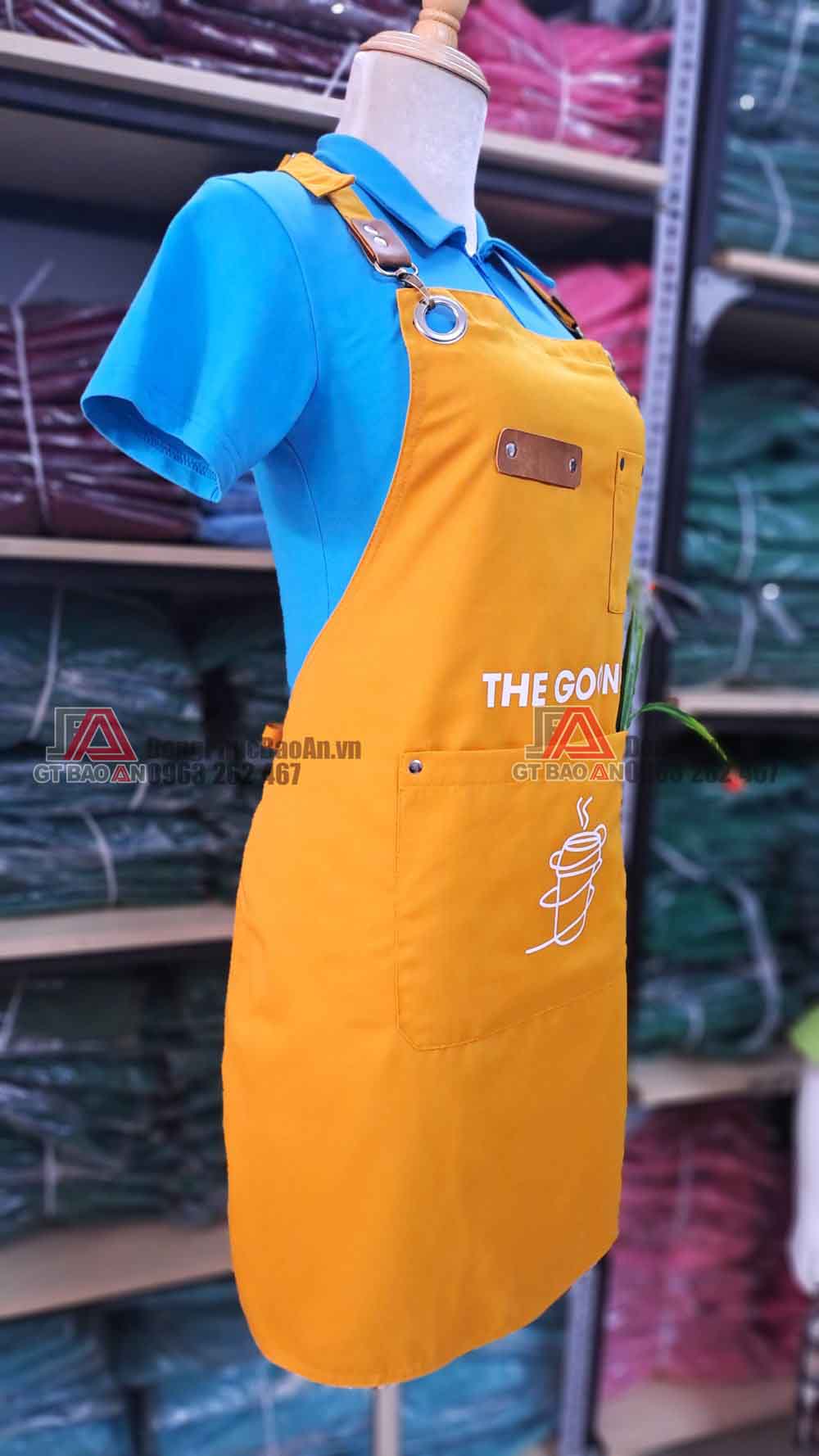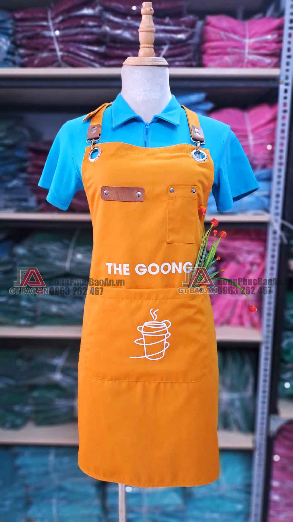 Hãy cùng GT BẢO AN tham khảo mẫu tạp dề quán cafe màu vàng, tạp dề dài đồng phục in logo giá rẻ TPHCM -The Goong. Tạp dề giá rẻ tại xưởng TPHCM – Bình Dương.