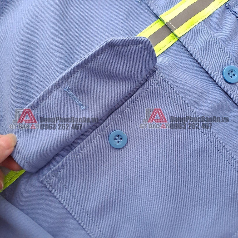 – Áo bảo hộ cổ bẻ, tay dài, có nút cài. Phần khuy cài áo được thiết kế thêm phần che phủ bên ngoài, mang lại vẻ đẹp hiện đại hơn cho người mặc.Có dây phản quang được may từ trước ra sau lưng áo.