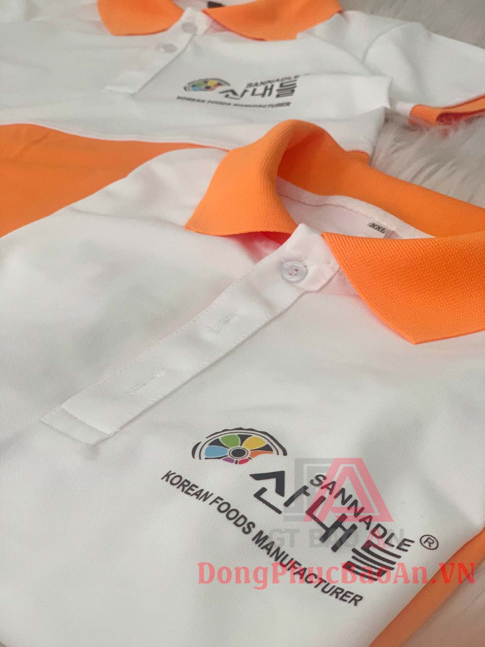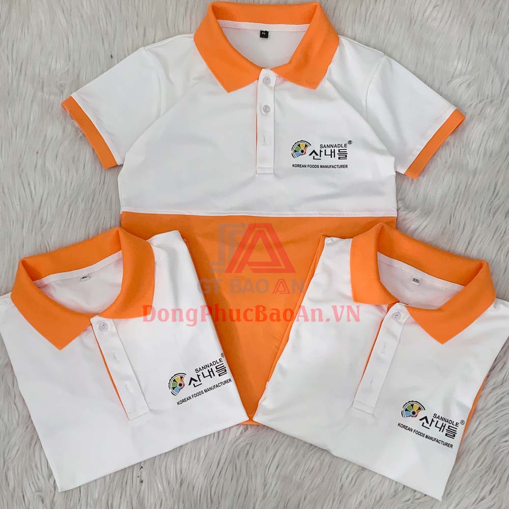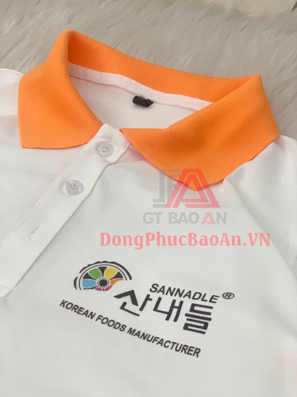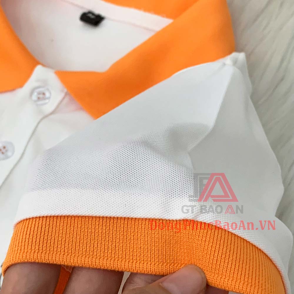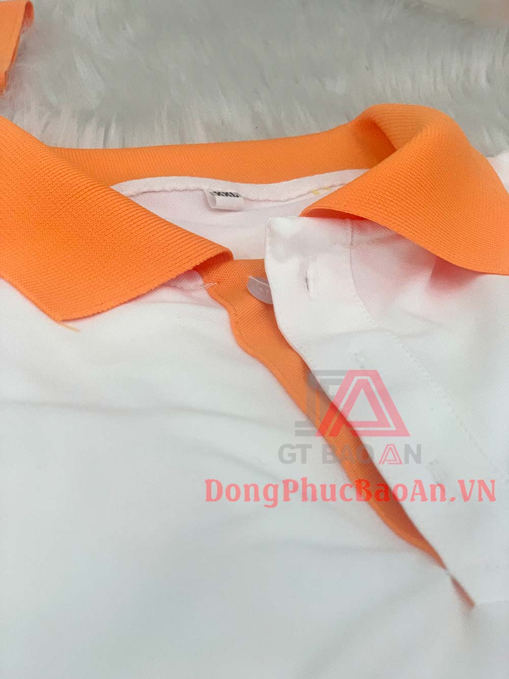 May áo đồng phục giá rẻ TPHCM quận Bình Tân – Mẫu áo thun cổ trụ màu trắng phối cam SANNADLE