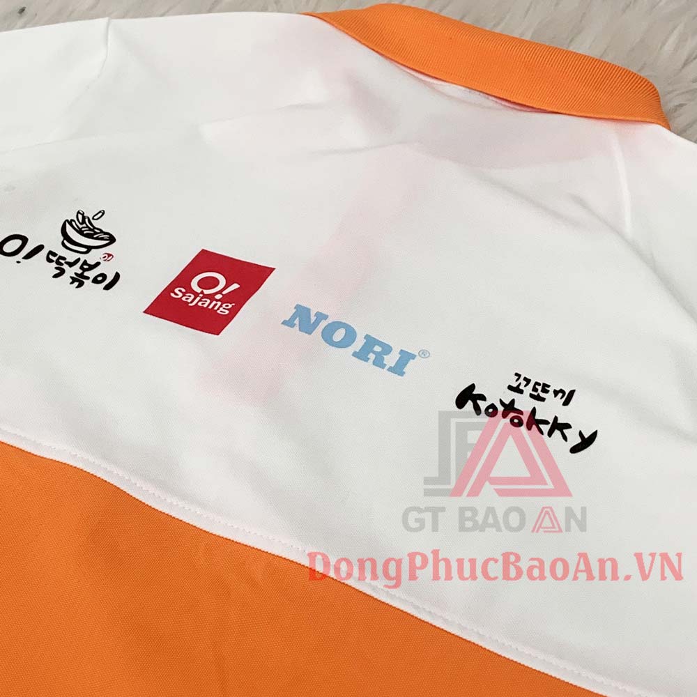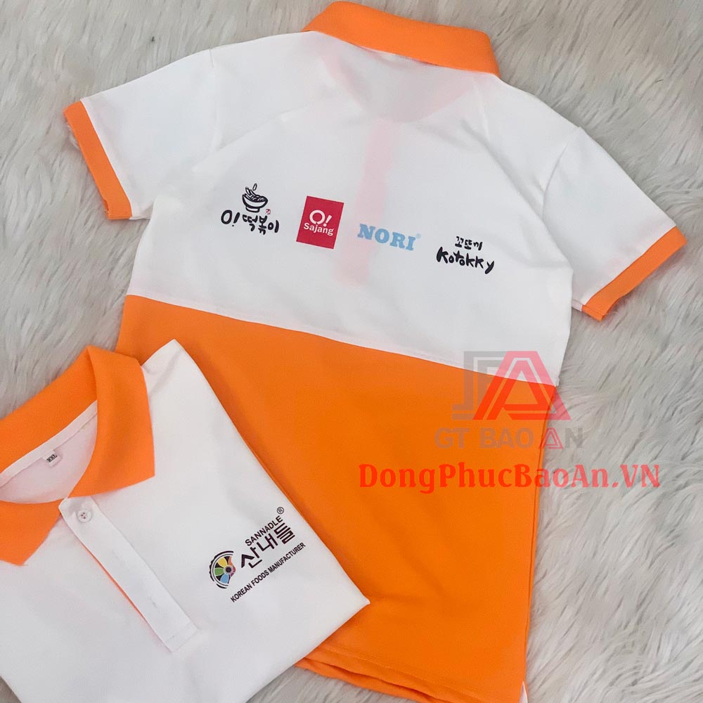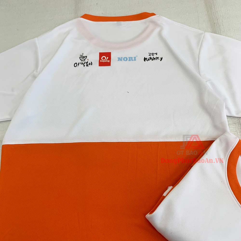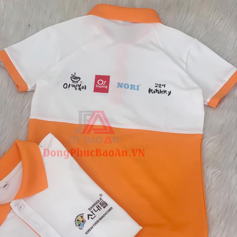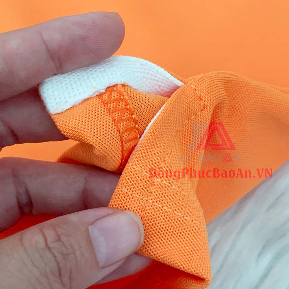 May áo đồng phục giá rẻ TPHCM quận Bình Tân – Mẫu áo thun cổ trụ màu trắng phối cam SANNADLE