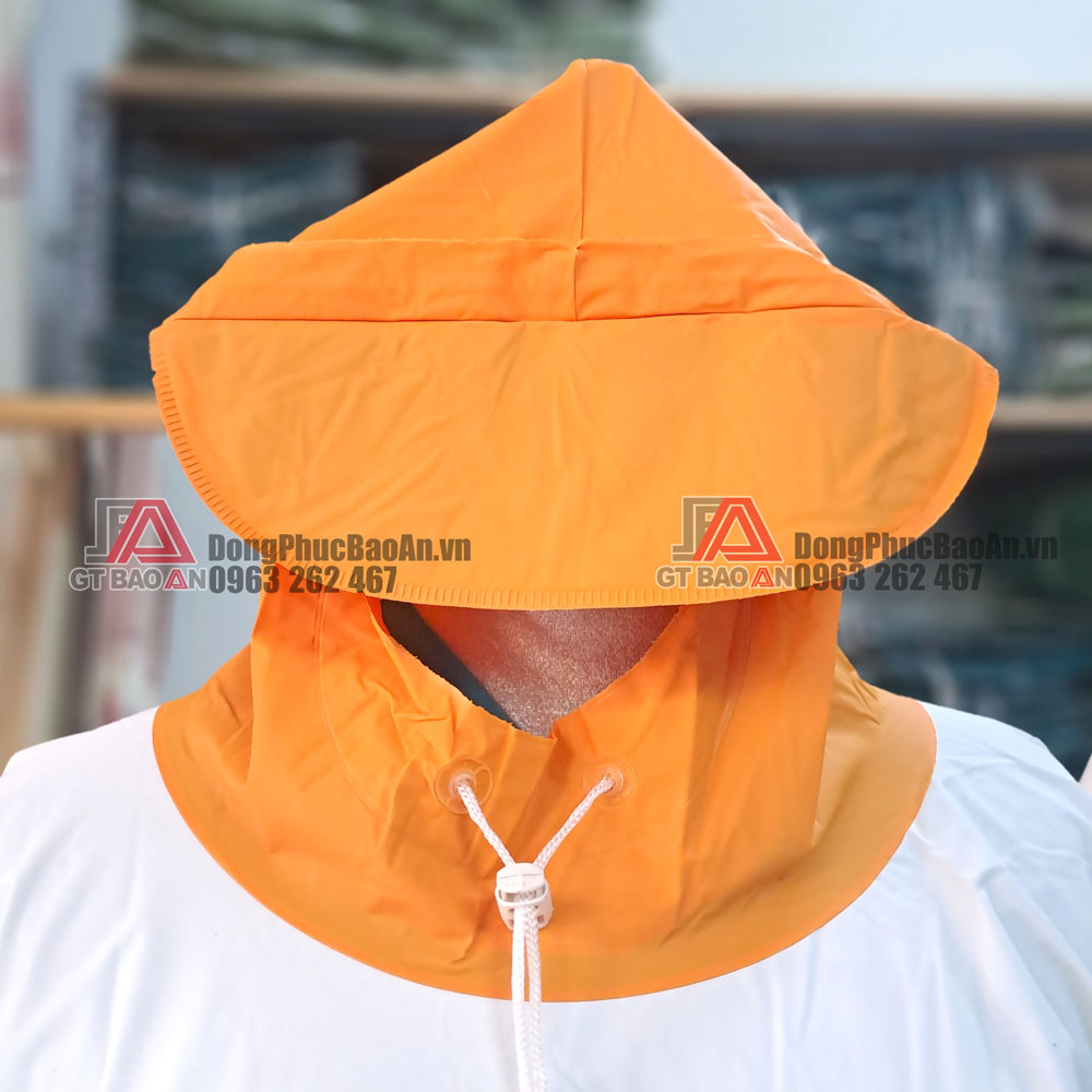 - Mũ trùm có vành rộng, phần lưỡi trai cứng, giúp hạn chế nước mưa tạt vào mặt và chảy xuống cổ áo.