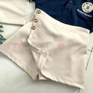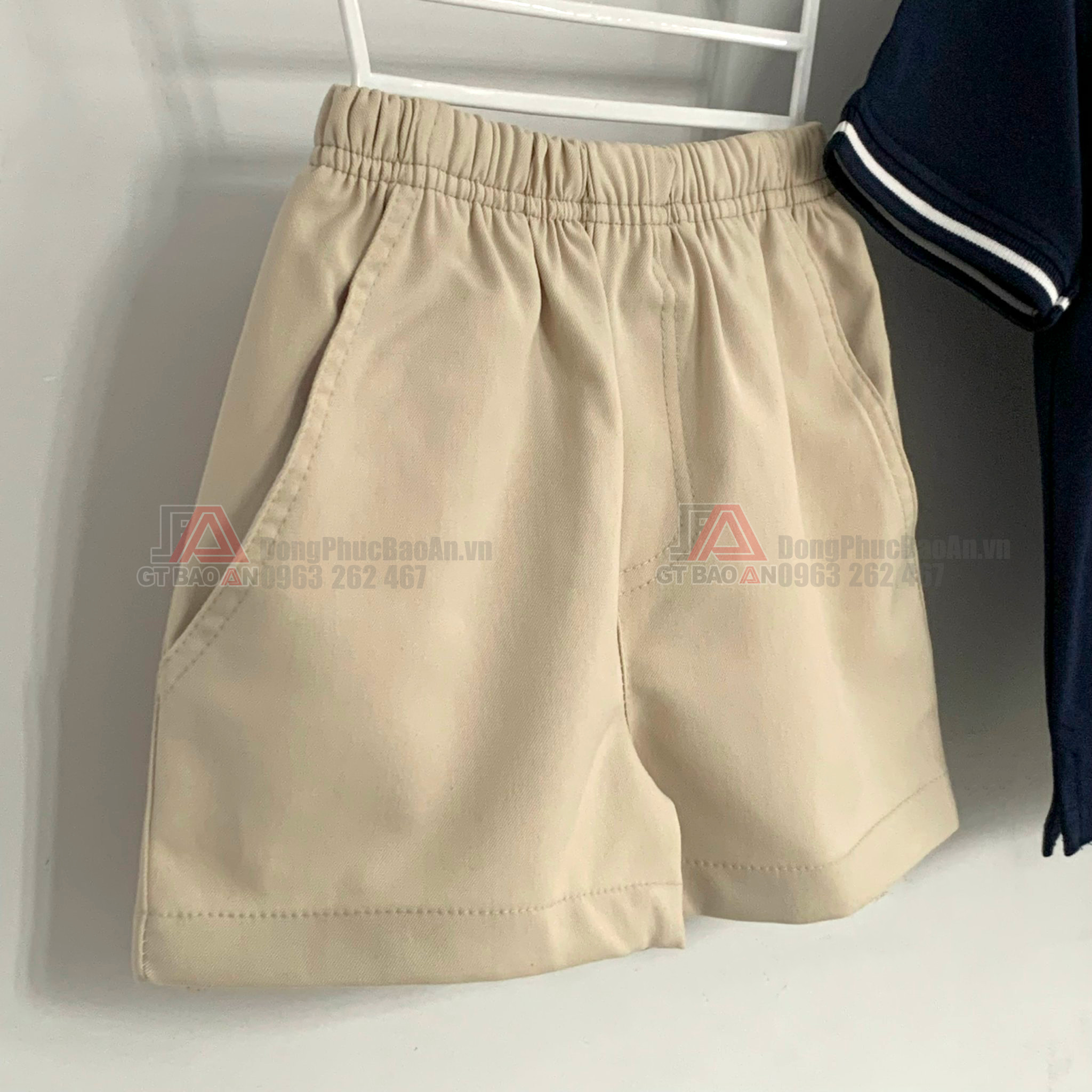 Quần ngắn bé trai màu kem có phối lưng chun giúp bé mặc dễ dàng, 2 bên có 2 túi đựng. Quần váy bé gái có đính 3 khuy bên hông tà. Quần váy được làm từ vải kaki thun dày dặn.
