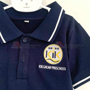 Đồng phục trẻ mầm non KIK Group Preschool với thiết kế theo kiểu phương Tây. Đây là mẫu áo màu xanh đen với kiểu cổ bẻ phổ biến, tạo sự năng động, khỏe khoắn cho các bé vui chơi. Với thiết kế tay ngắn giúp các bé thoải mái và dễ mặc. Có phối viền trắng ở cổ và tay áo tạo điểm nhấn.