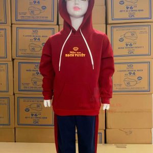 Đơn may đồng phục thể dục mầm non Bạch Tuyết được thiết kế và sản xuất theo yêu cầu. Bộ quần áo đồng phục thể dục cho học sinh bao gồm áo hoodie và quần thể dục dài lưng thun. Các chi tiết được phối may kỹ lưỡng, cụ thể: