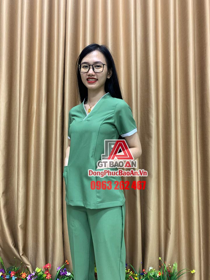 ![[May Sẵn] Bộ Scrubs đồng phục điều dưỡng cao cấp màu Xanh Vỏ Đậu - Quần áo Blouse cổ tim cho nữ y tá, điều dưỡng, hộ lý bệnh viện, nhân viên spa - thẩm mỹ viện](https://dongphucbaoan.vn/wp-content/uploads/2021/08/spa-xanh-dau-04.jpg)