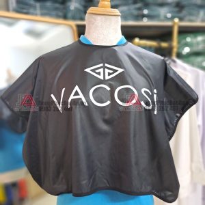 Áo choàng make up chống thấm cao cấp VACOSI màu đen được thiết kế theo yêu cầu. Áo có kích thước lớn, đủ để phủ phần trên thân của khách hàng tại tiệm mỹ phẩm làm đẹp. Từ đó, giúp ngăn ngừa tuyệt đối những vết lem hoặc bụi phấn rơi vào người khách.