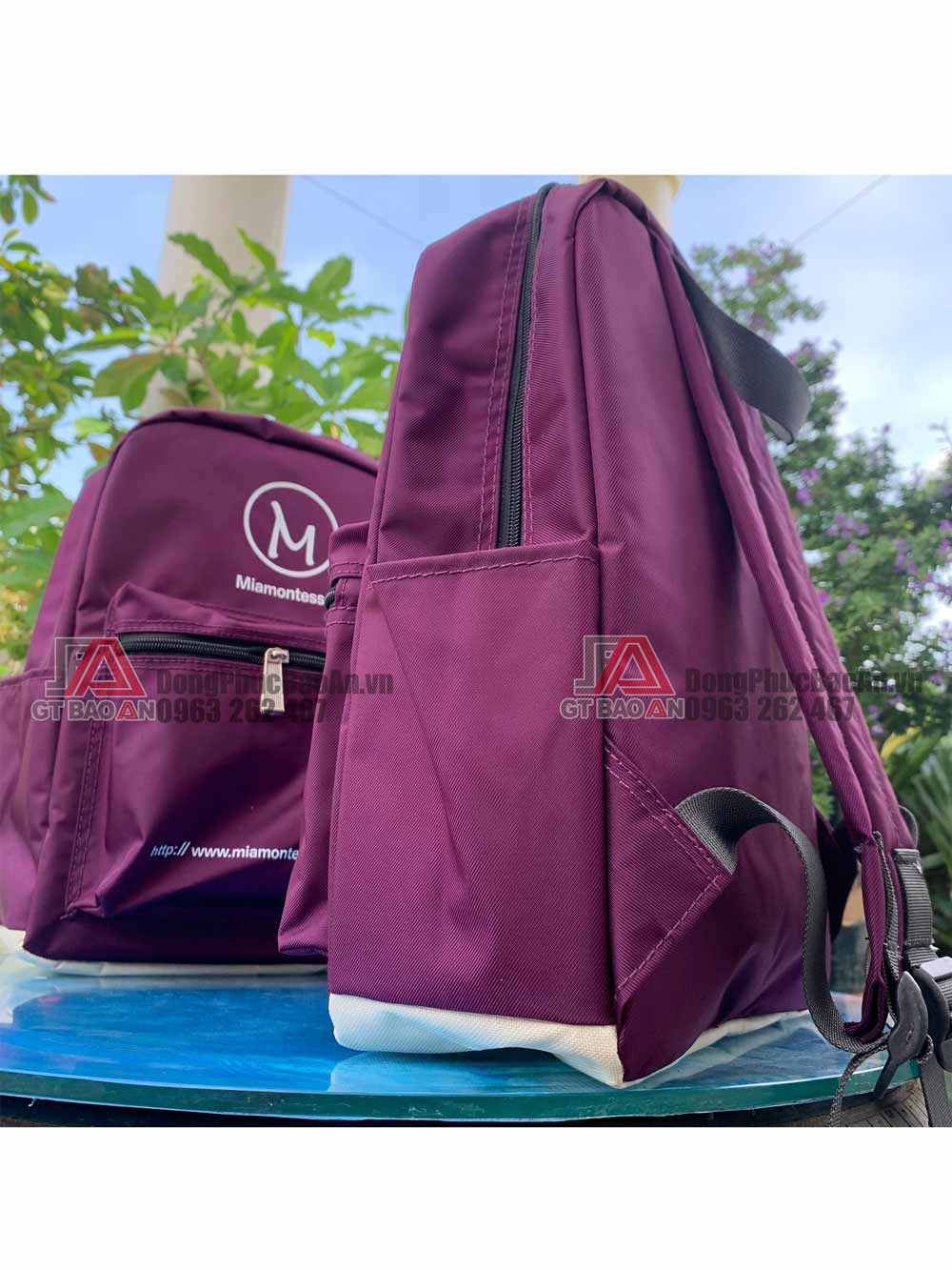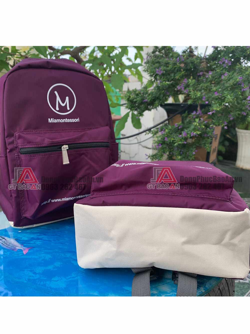 Mẫu balo đồng phục cho bé mầm non Miamontessori có màu tím dễ thương, balo mầm non đồng phục cao cấp gồm hai ngăn: