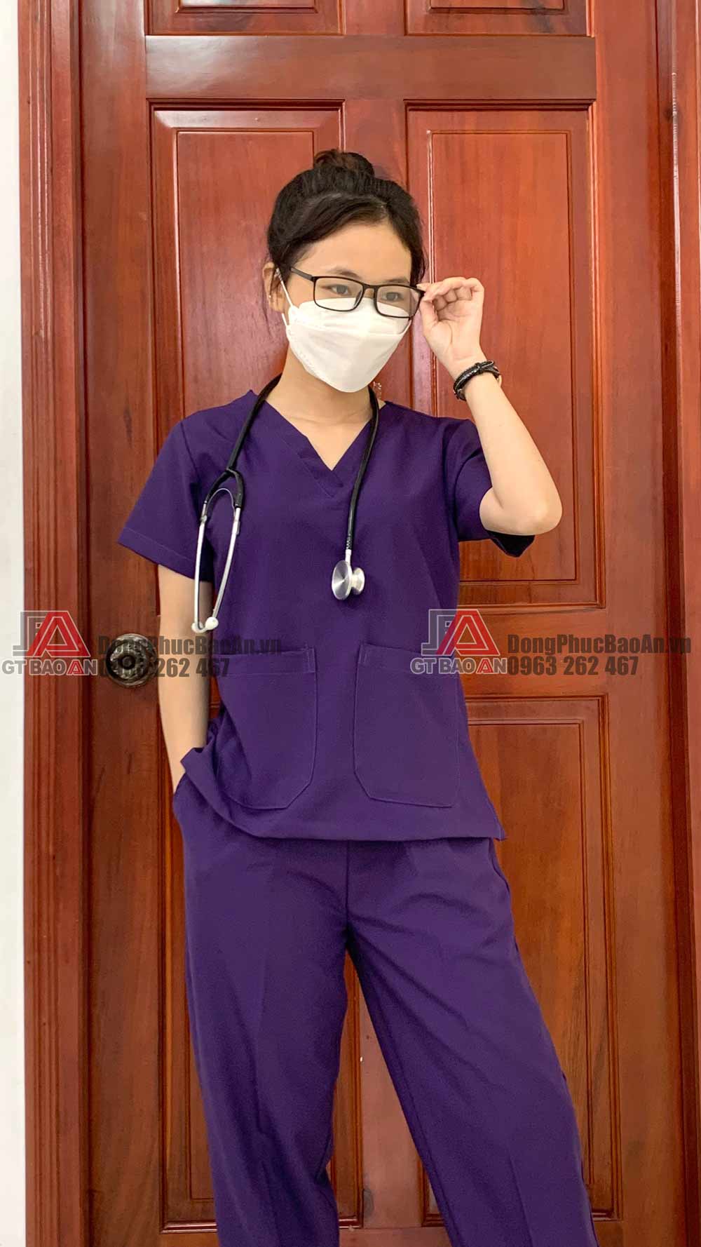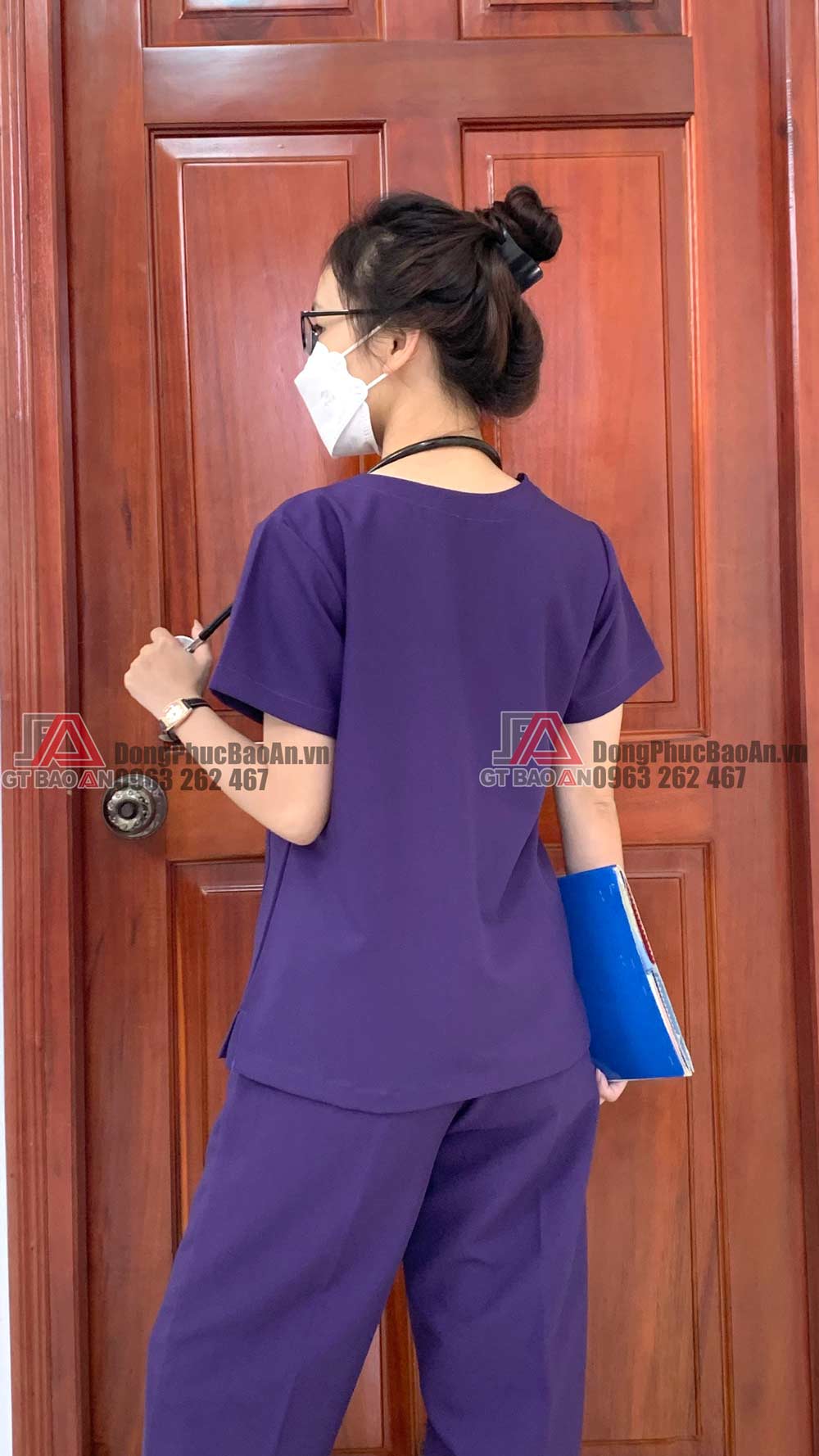 Bộ quần áo Scrubs giá rẻ, đồng phục spa, thẩm mỹ viện, phòng khám bệnh viện có màu tím đậm, thiết kế đơn giản. Bộ đồng phục Blouse – spa gồm áo Blouse điều dưỡng tay ngắn cổ V và quần Blouse dài ống rộng.