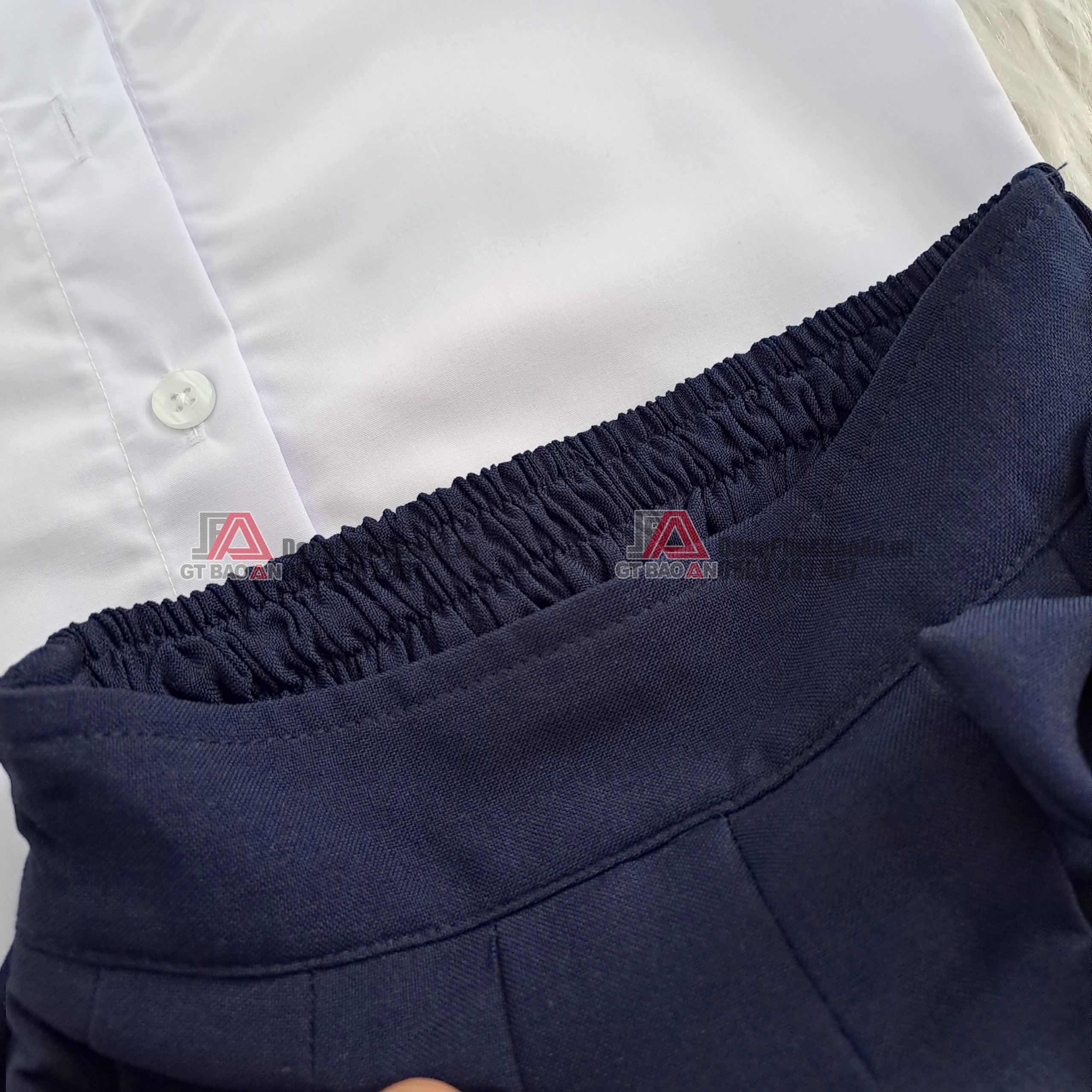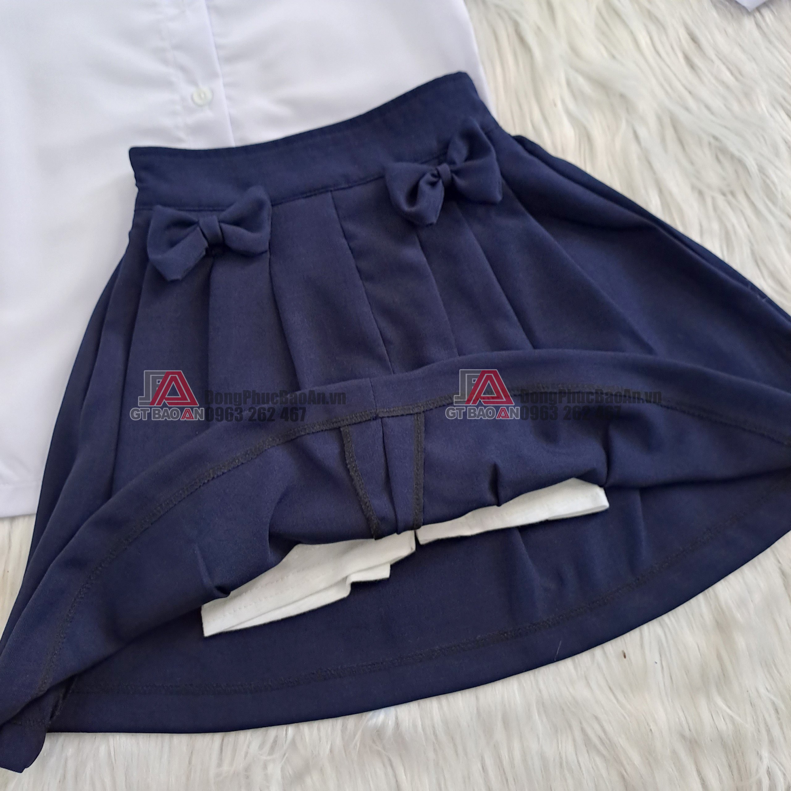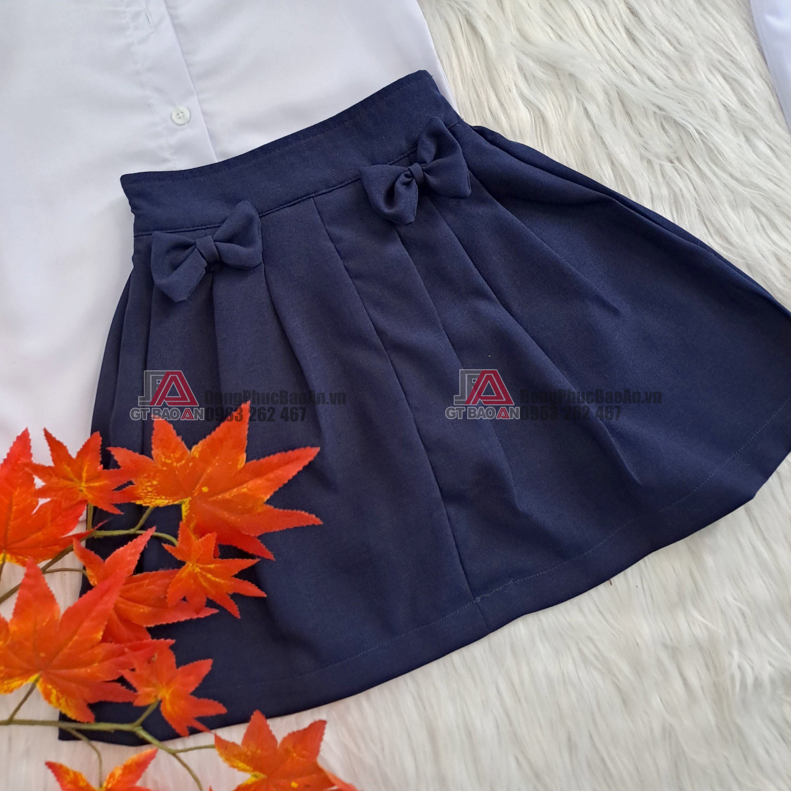 Váy đồng phục học sinh cấp 1 may sẵn cho bé gái có màu xanh đen cùng màu phối của áo.