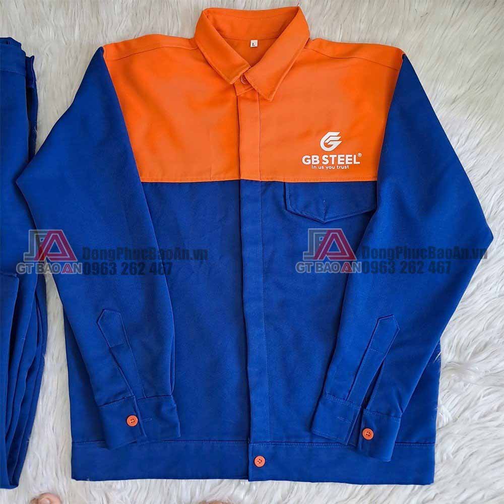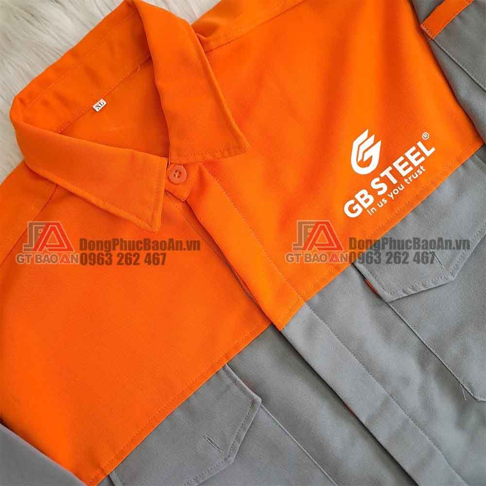 Mẫu đồ bảo hộ cho nhà thép có in logo theo yêu cầu Công ty thép GT Steel có 2 màu: Xanh phối cam, xám phối cam, form áo suông dài, tạo sự thoải mái và thuận tiện khi làm việc hay di chuyển.