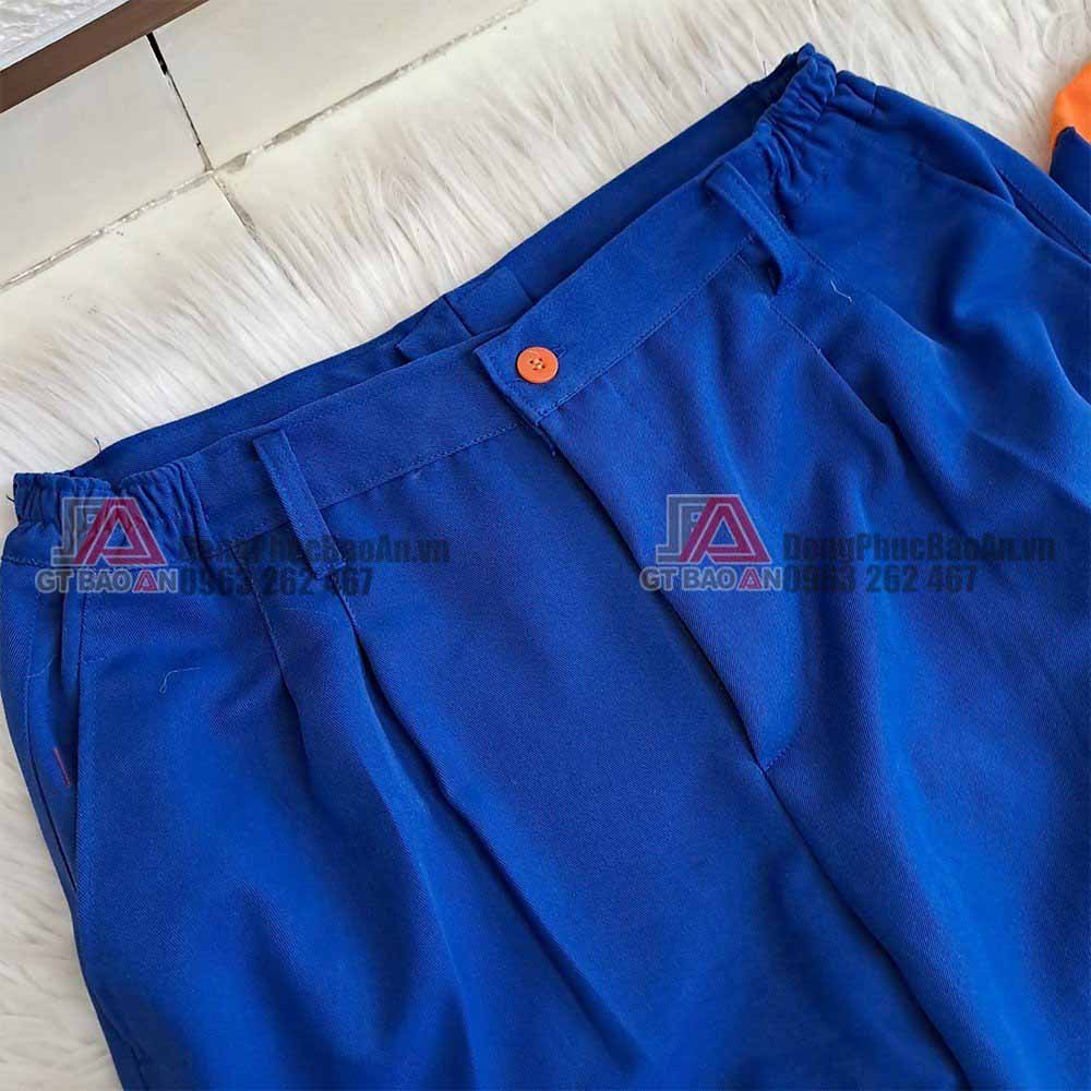 Quần bảo hộ dáng dài, ống suông, tôn dáng cho người mặc. Quần khóa kéo, với 2 phần nhỏ bên hông lưng quần được may dún thun, đảm bảo vừa người khi mặc. Quần có thiết kế thêm 2 túi ở bên hông và 1 túi phía sau có thể đựng những vật dụng quan trọng khi làm việc.
