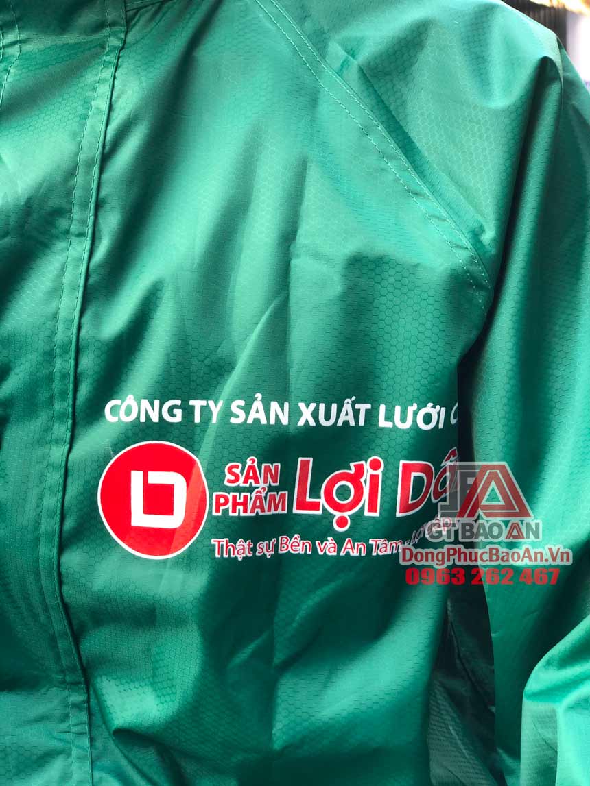 Đặt áo mưa cho công ty Lợi Dân được thiết kế theo kiểu dáng áo mưa bộ quần riêng – áo riêng. Bộ quần áo áo mưa được sản xuất từ chất liệu vải dù vân tổ ong cao cấp. Chất vải không thấm nước và trượt nước nhanh, chỉ cần giũ mạnh là hết nước đọng trên áo. Vải dày, đẹp, độ bền cao.